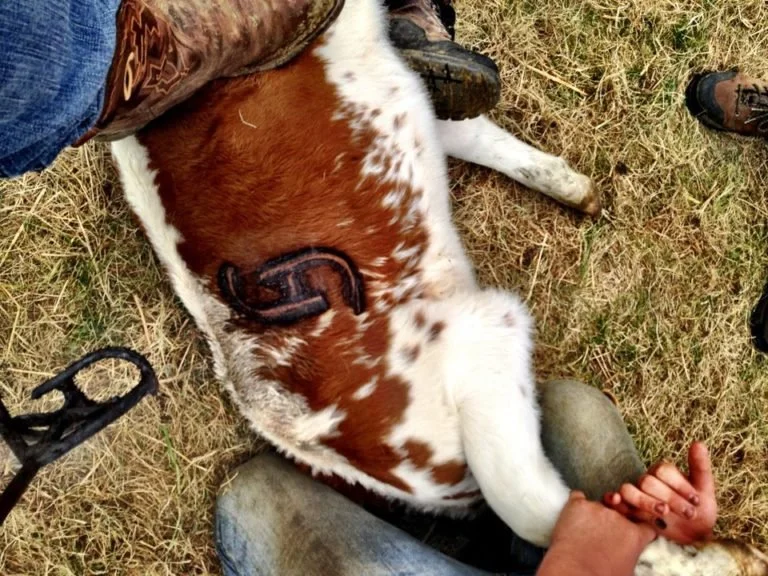 Early lives for calves born into the meat industry go through a series of painful mutilations, usually performed with no pain relief given. Dehorning or disbudding, the process of removing the horn bud, typically using a hot iron. Castration is typically done by banding, cutting off the circulation until the testes fall off. Branding, typically done between two and four months old, burns the skin with a hot iron so ownership is claimed.