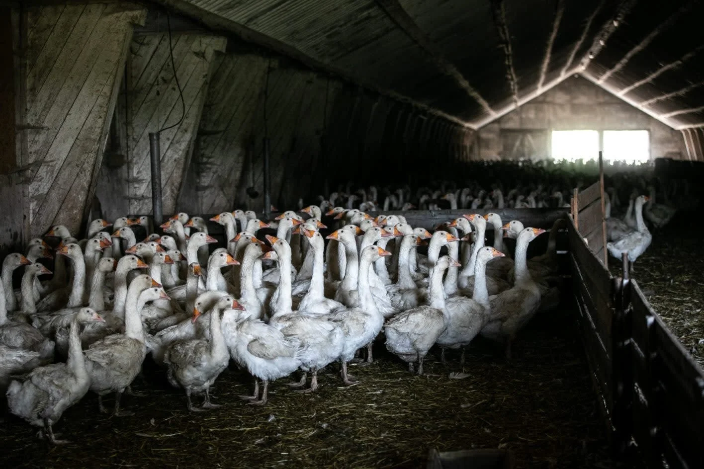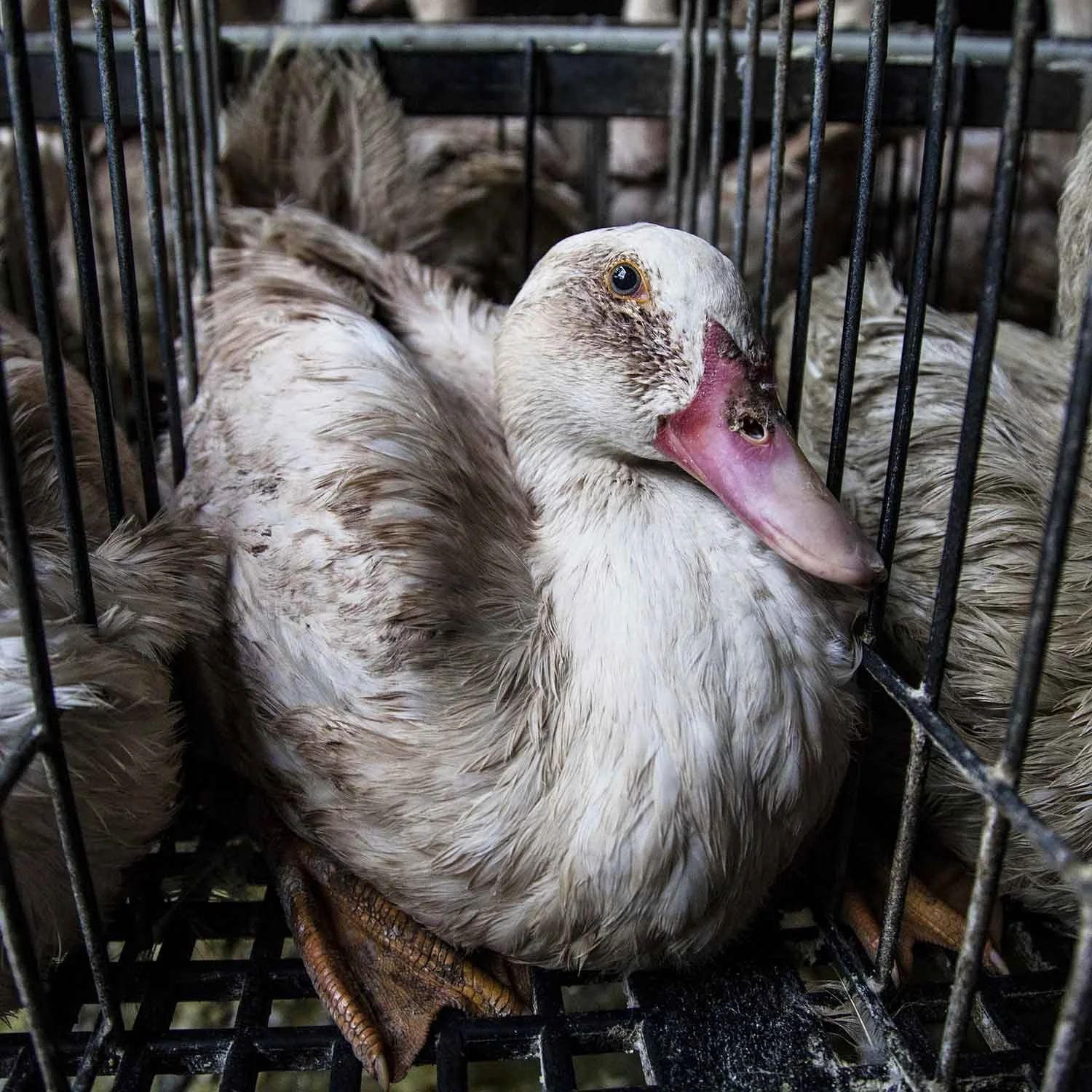 Ducks and geese are both waterfowl species. This means that they require open water for their health, like cleaning themselves, eye and nostril health, hydration and digestion, and to keep cool in hot weather. Ducks and geese that are packed into sheds by the thousands with only wire, dirt, and feces to stand on. They will get a trickle of water for drinking and will never get access to open water, meaning they’re unable to clean themselves properly, subsequently spreading infections and diseases.